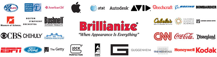 当外表几乎代表一切时,需要依赖Brillianize。这些著名的公司,如Apple®, General Motors®, Harley Davidson®, Honda®, Ford®, Kyocera®, Mitsubishi®, Beechcraft®, Gulfstream®, Tama Drums®, Smithsonian Institution®, Solomon R. Guggenheim Museum®, CHANEL®, Gucci®, Hard Rock® Café以及其它公司都在使用Brillianize产品。这些公司和Brillianize一样,都将自己的信誉与产品性能与外观捆绑在一起。